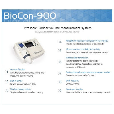 The MCube BioCon-900 is a portable non-invasive wireless ultrasonic bladder scanner used for measuring bladder volume. The real time pre-scan function helps to locate the patient’s bladder prior to scanning and improves the accuracy of results. Easy-to-use colour TouchScreen determines bladder outline and volume for quick access and immediate printout of results via the internal printer, or use the included software to upload saved data to a computer for later review.
